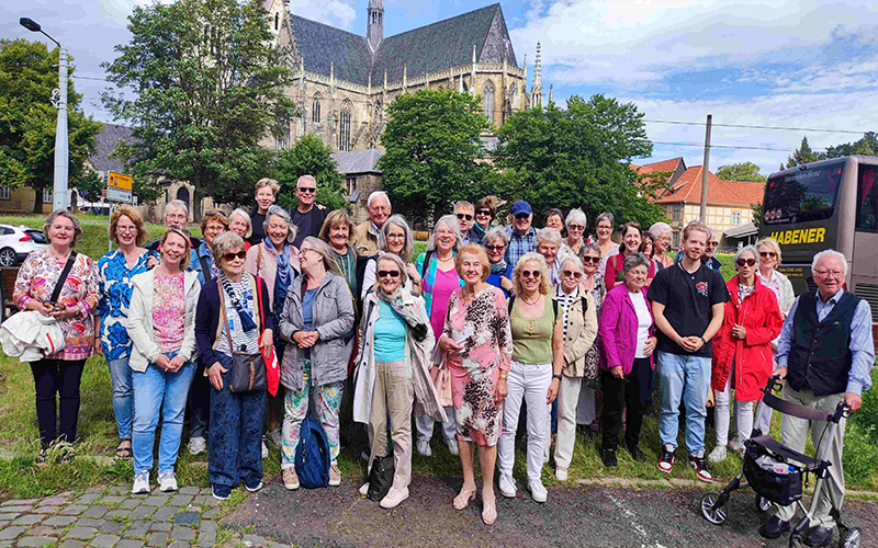 Anlässlich der 35-jährigen Partnerschaft zwischen Halberstadt und Wolfsburg fand Anfang Juli eine Bürgerreise des IFK in die Domstadt statt, an der 39 Personen teilnahmen. Zwei Stadtführerinnen begleiteten die Gäste durch den Vormittag. Zu Beginn wurde der Turm der Martinikirche bestiegen. Oben angekommen nahm ein Turmwächter die Teilnehmenden in Empfang, der alte Anekdoten zur Stadtgeschichte preisgab. Dann ging es zum Domplatz, auf dem der jährliche Töpfermarkt „Ton am Dom“ stattfand. Eröffnet wurde die Veranstaltung mit einer Ansprache durch einen Bürgermeister der Stadt, in der die Wolfsburgerinnen und Wolfsburger herzlich begrüßt wurden. Am frühen Nachmittag hatten die Teilnehmenden Zeit zur freien Verfügung oder auch die Gelegenheit mit einer Stadtführerin die Altstadt zu erkunden. Es gab vieleInformationen über das alte Halberstadt, vom Mittelalter, über die Weltkriegszeit und DDR-Zeit bis heute. Auf dem Burgmarkt mit einem großen Angebot an diversen Töpfersachen konnten sich die Teilnehmenden auch kulinarisch stärken, bevor sie die Möglichkeiten hatten, im Dom diverse Konzerte zu besuchen.