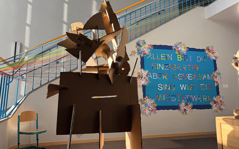 Das Spektrum reichte von Miniaturfotografien über Acrylmalerei bis hin zu einer deckenhohen Rauminstallation. Die Schülerinnen und Schüler entwickelten ihre Ideen gemeinsam und setzten sie während der Woche eigenständig um. Den Abschluss bildete eine Ausstellungseröffnung für Eltern und Familien. Die Kinder führten die Gäste durch die gestalteten Bereiche des Schulgebäudes und präsentierten ihre Arbeiten. Die Projektwoche zeigte, wie Schülerinnen und Schüler ihren Lernort kreativ mitgestalten können.