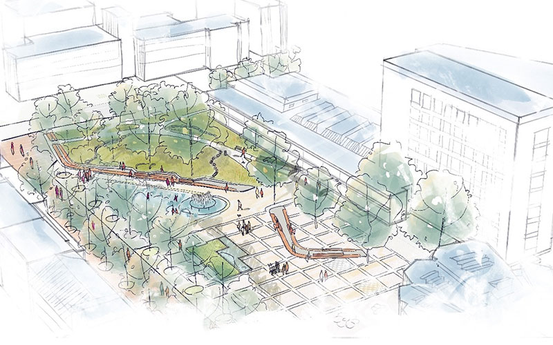 Aus Grau macht Grün: Der Rathausplatz ist auf dem Weg zum lebendigen, grünen Mittelpunkt am Südkopf. Die Planungen zur Neugestaltung des Klimalabor Rathausplatz sehen Wasserfontänen, einen großen Grünbereich sowie Sitz-, Liege- und Aufenthaltsflächen vor. Außerdem bekommt der Rathauseingang seine historische Erscheinung zurück. Daneben stärken die Maßnahmen den Platz als zentrale Veranstaltungsfläche. Die entsprechende Objektvorlage startet jetzt in die politische Beratung. Eine Entscheidung trifft der Rat der Stadt Wolfsburg am 13. Mai.